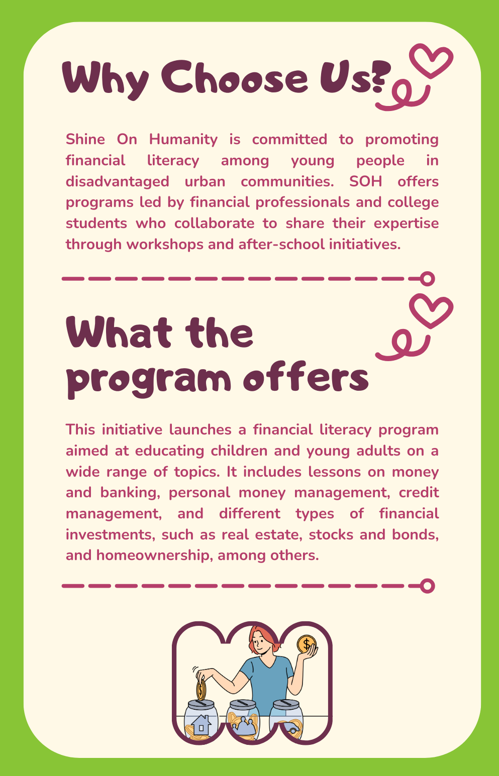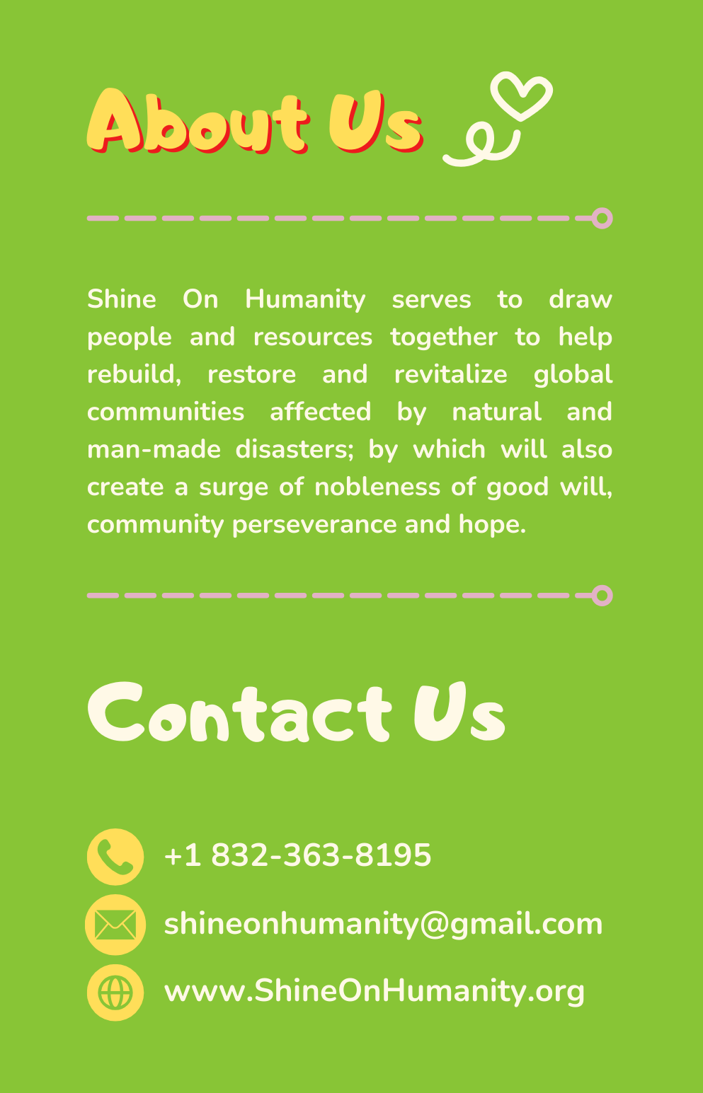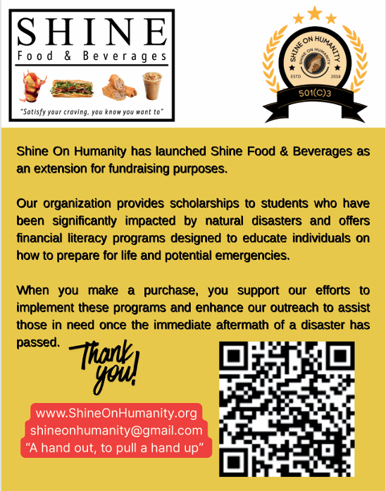 If you or someone you know is interested in partnering, volunteering, or benefiting from these programs, please contact us via email at ShineOnHumanity@gmail.com with a subject of SCHOLARSHIP PROGRAM or
